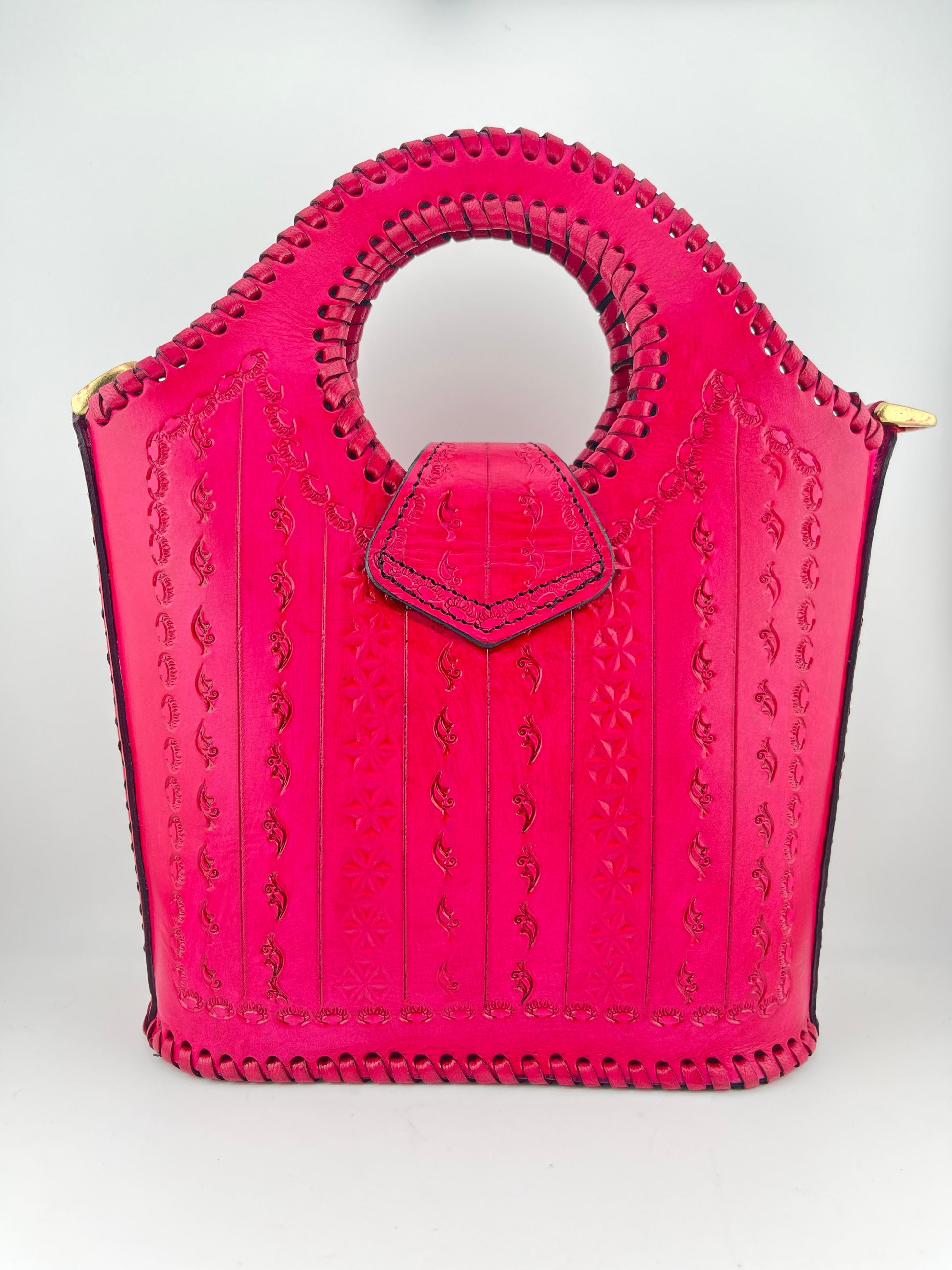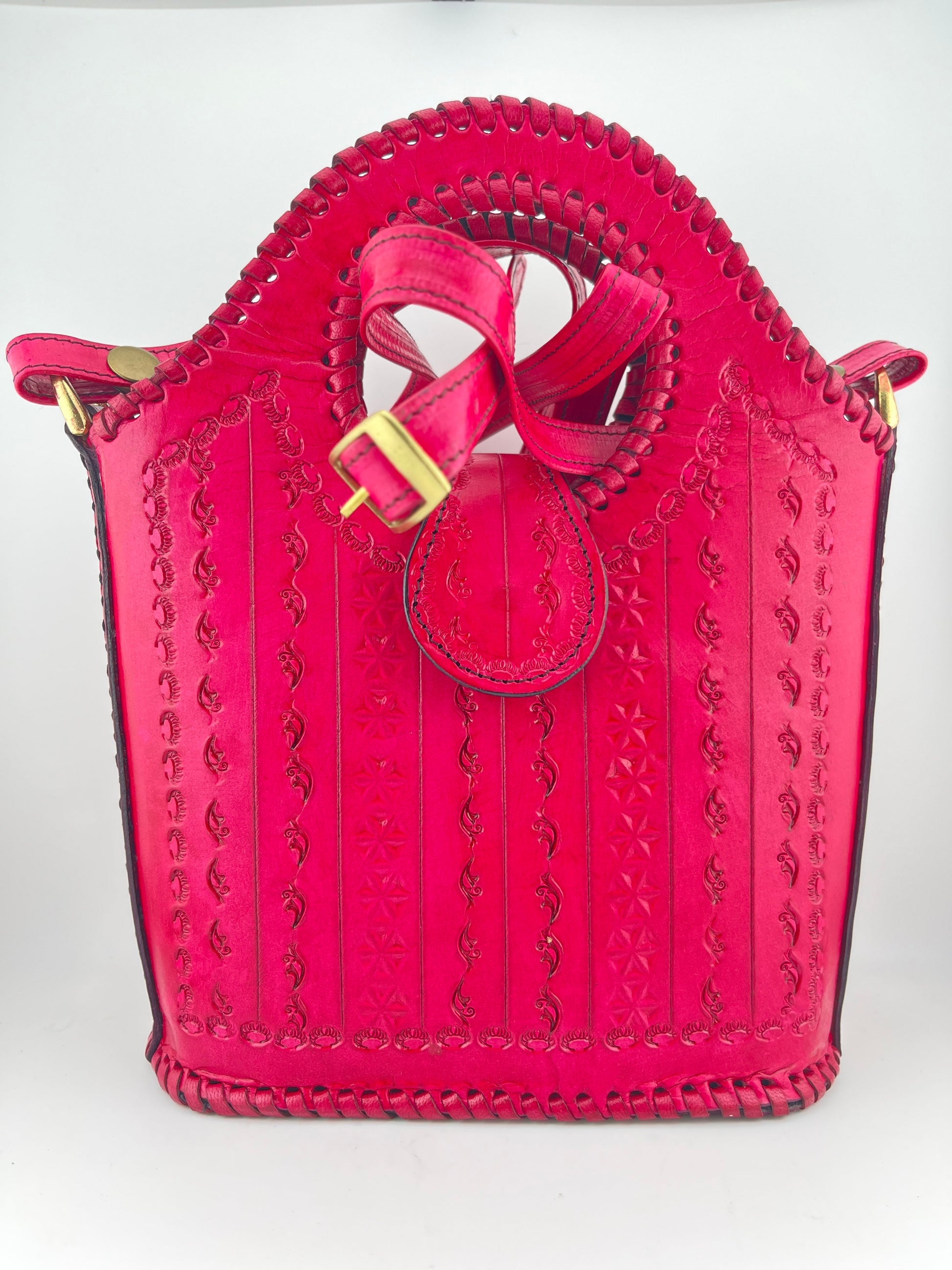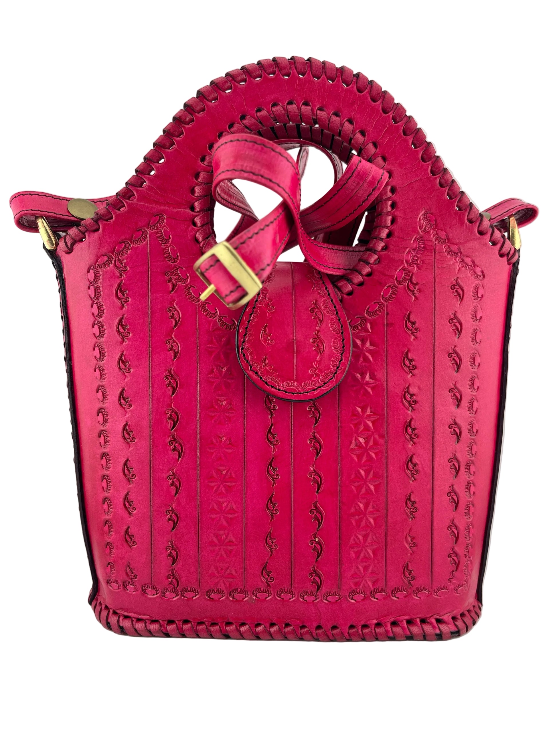 The structured silhouette ensures the bag retains its shape, while the rich pink leather develops a beautiful natural patina over time. The reinforced edges and hand-laced leather detailing enhance strength and longevity. An adjustable leather shoulder strap with antique-finish brass hardware offers comfort and versatility, allowing it to be carried as a handbag or shoulder bag.